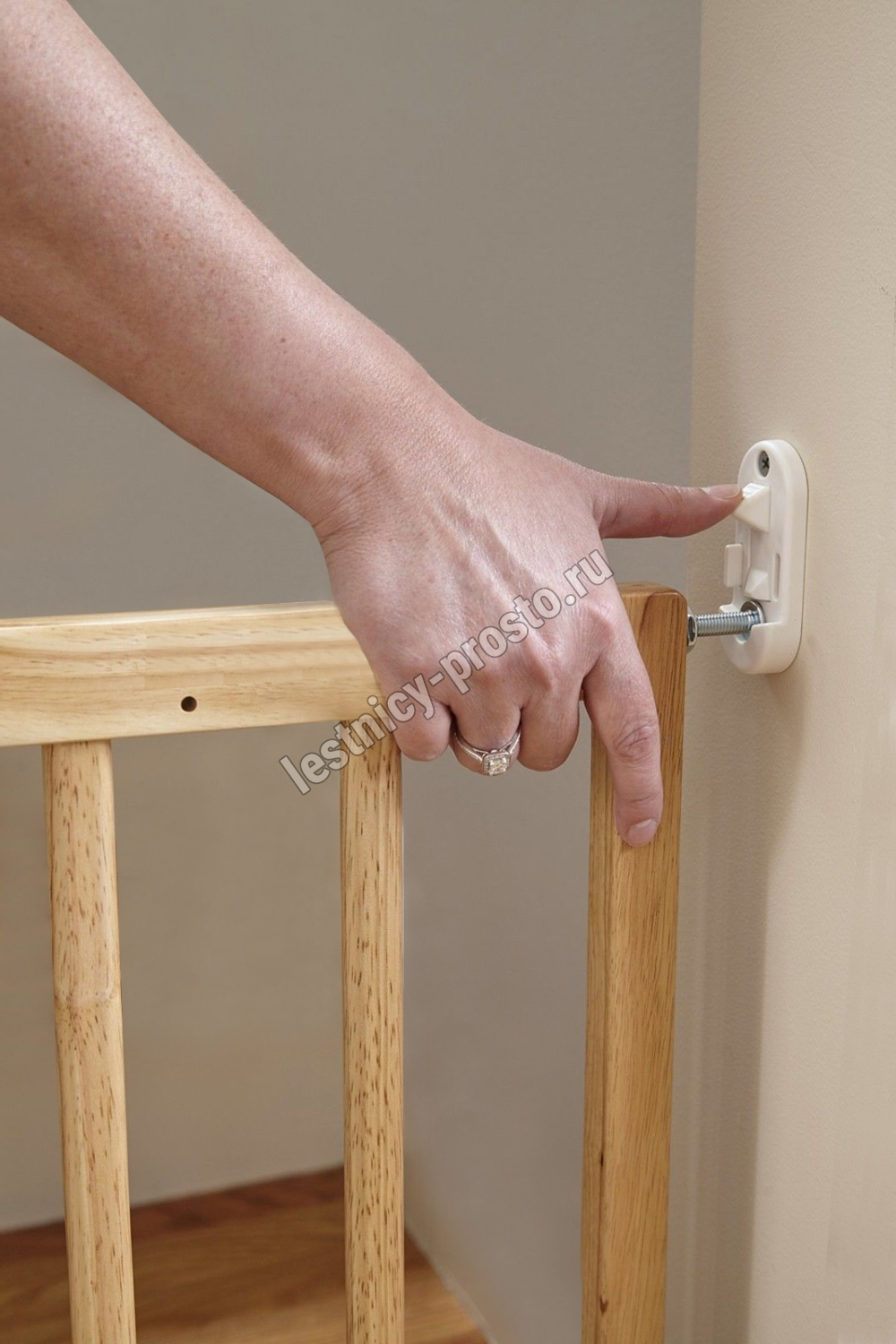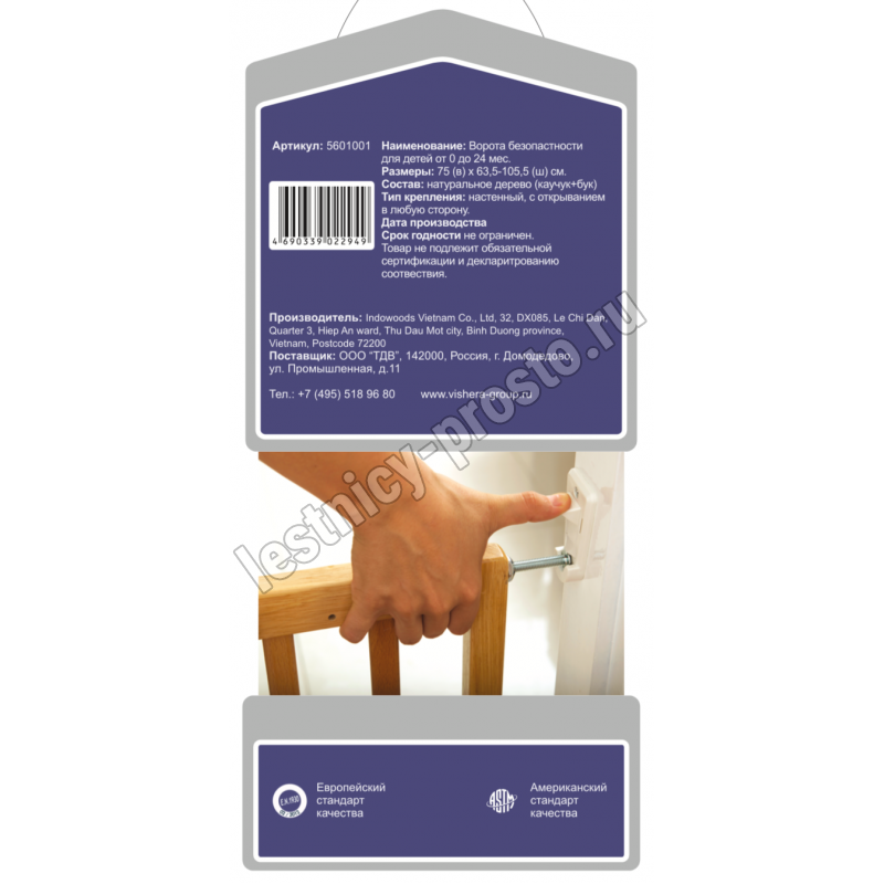 Изделие имеет раздвижную конструкцию с большим диапазоном - от 63.5 до 105 см и может быть установлено в любые дверные или лестничные проемы,  в качестве основного материала используется натуральное дерево (бук) с высококачественной  шлифовкой.