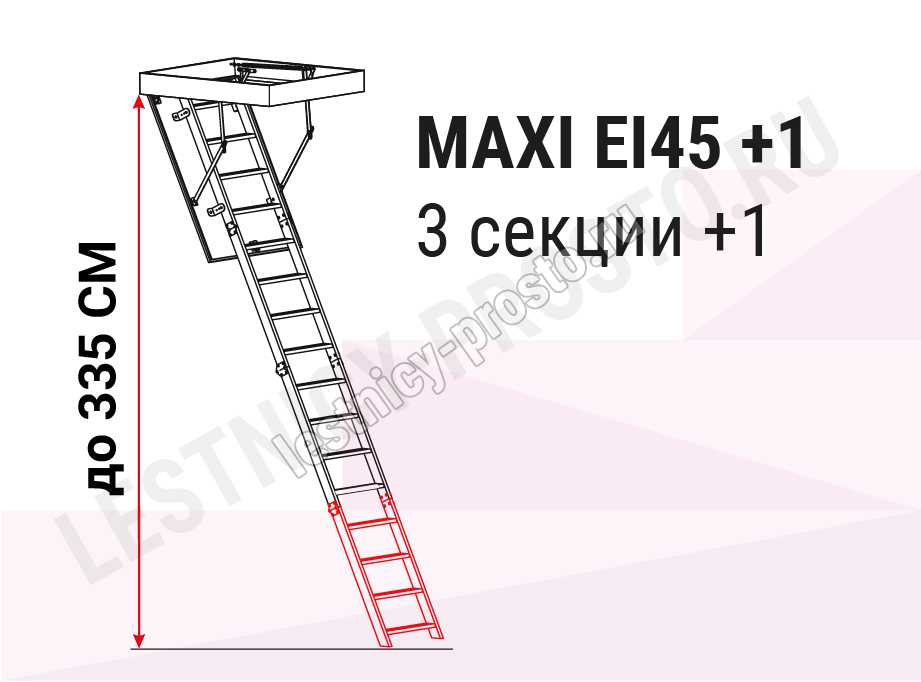 Данный вариант представляет из себя комплект из лестницы MAXI EI45 и дополнительной секции, увеличивающей базовую высоту до 3350 мм.