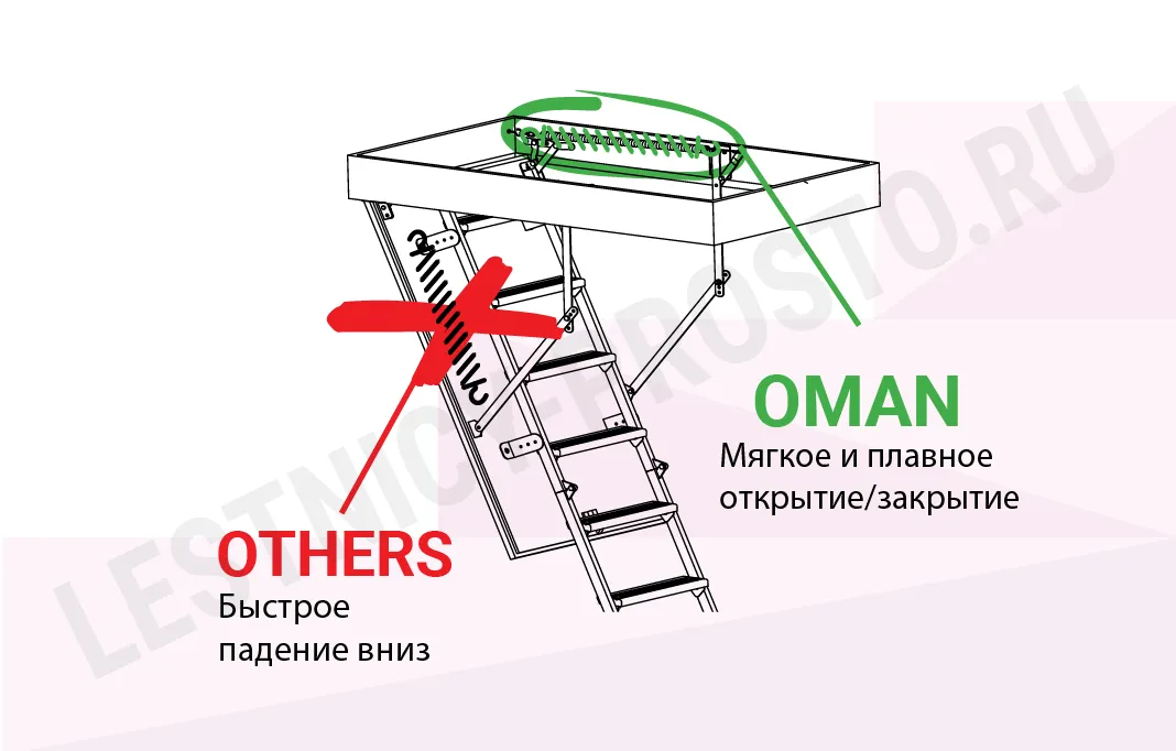 Термоизоляционная крышка имеет усиленную теплозащиту, облицована с двух сторон ДCП белого цвета. В комплекте деревянный стержень для открывания, металлический поручень и защитные накладки на ножки. Лестница идеально подходит для соединения с холодным чердаком.