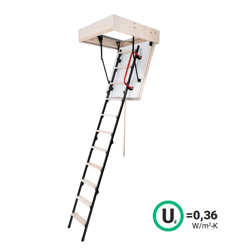 Складная 4-х секционная чердачная лестница. Ступени выполнены из сосны, имеют противоскользящие насечки, направляющие из металла
