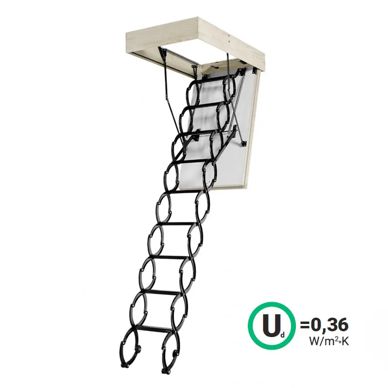Модель лестницы, благодаря использованию цельнометаллической ножничной конструкции, идеально подходит для установки в помещениях высотой до 290 см. Выбор лестницы NOZYCOWE TERMO SUPER - это инвестиция, которая позволяет минимизировать потери теплого воздуха и значительно снизить расходы на отопление.
