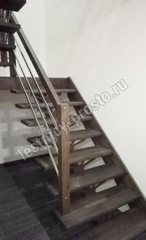 В комплекте: 3 прямых столба и профильный поручень без покрытия, комплект из 3 ригелей из стали (окрашены в цвет каркаса или хром по желанию) диаметром 12 мм. Ограждение начинается со второй ступени.