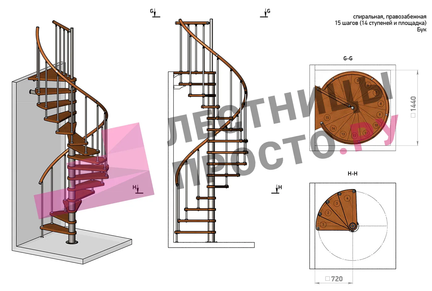 Винтовая лестница Prosto Spiral Black D140см, h325.7-369.8 см, бук