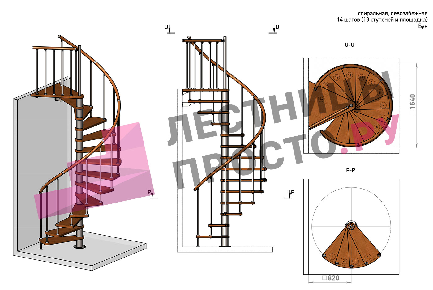 Правая, d=160см, 13 ступеней + площадка