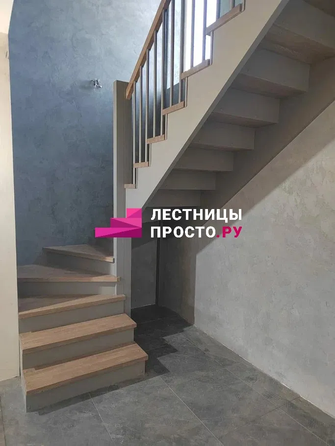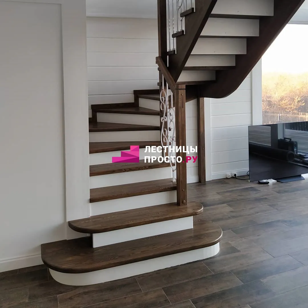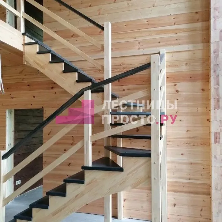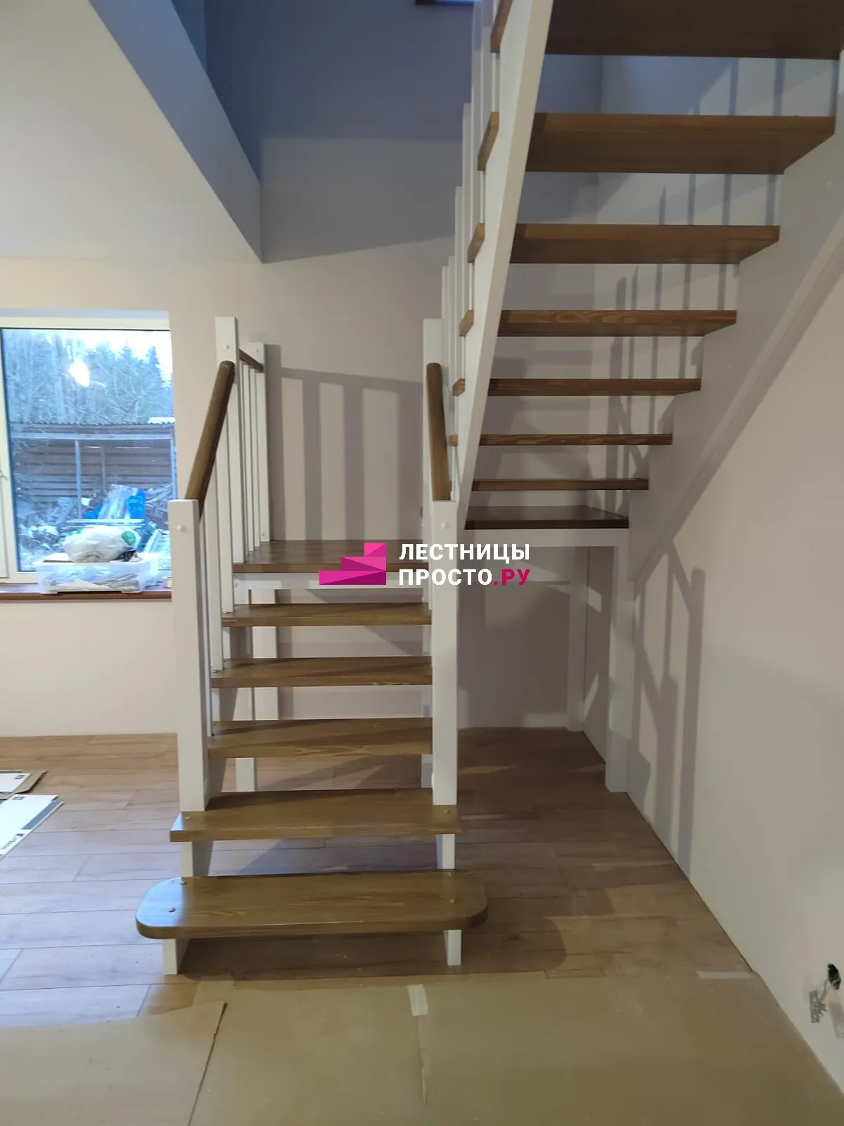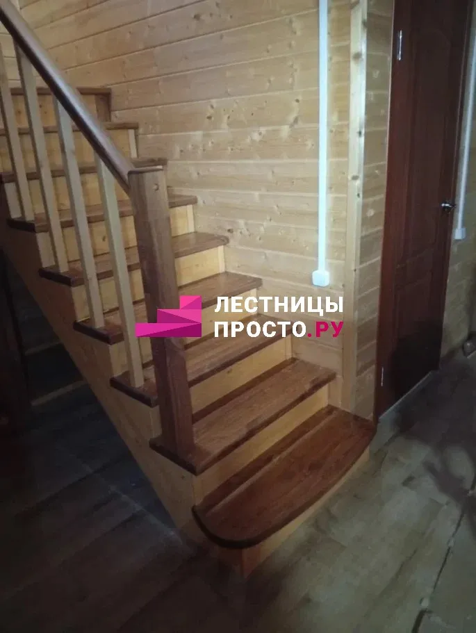 Лестница из сосны с поворотом и подступёнками для частного дома